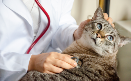 Pick cat up and cradle it in the crook of your left arm as if holding a baby. Position right…